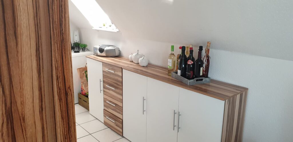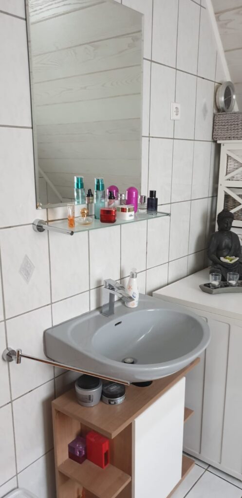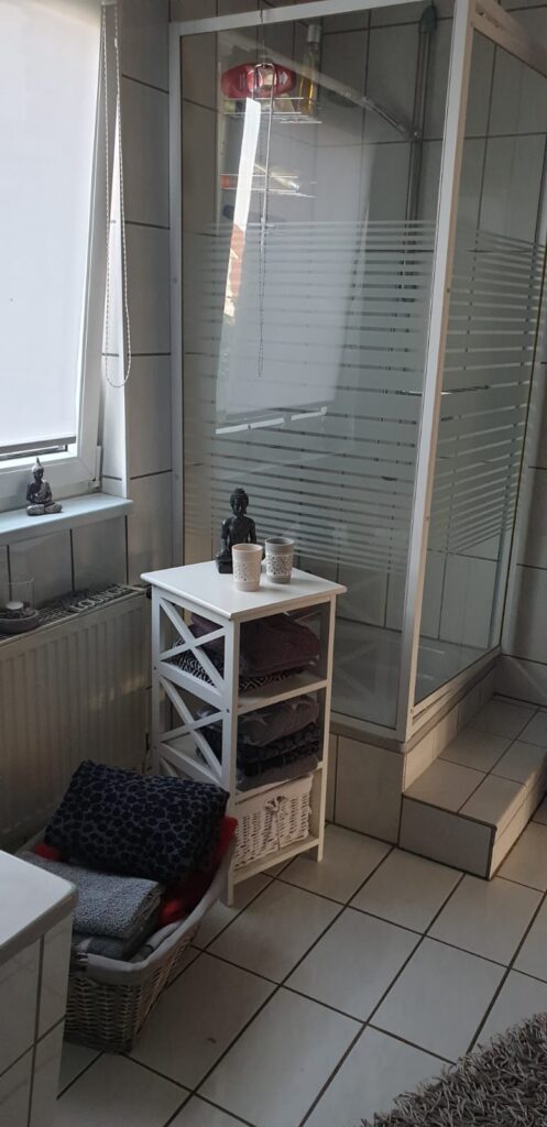 Das geräumige Badezimmer mit Dusche und Badewanne bietet Platz für Waschmaschine und Trockner (nebeneinander) und ist weiß gefliest. Ein großer Speicher oberhalb der Wohnung kann zusätzlich zur Abstellkammer als Stauraum genutzt werden.